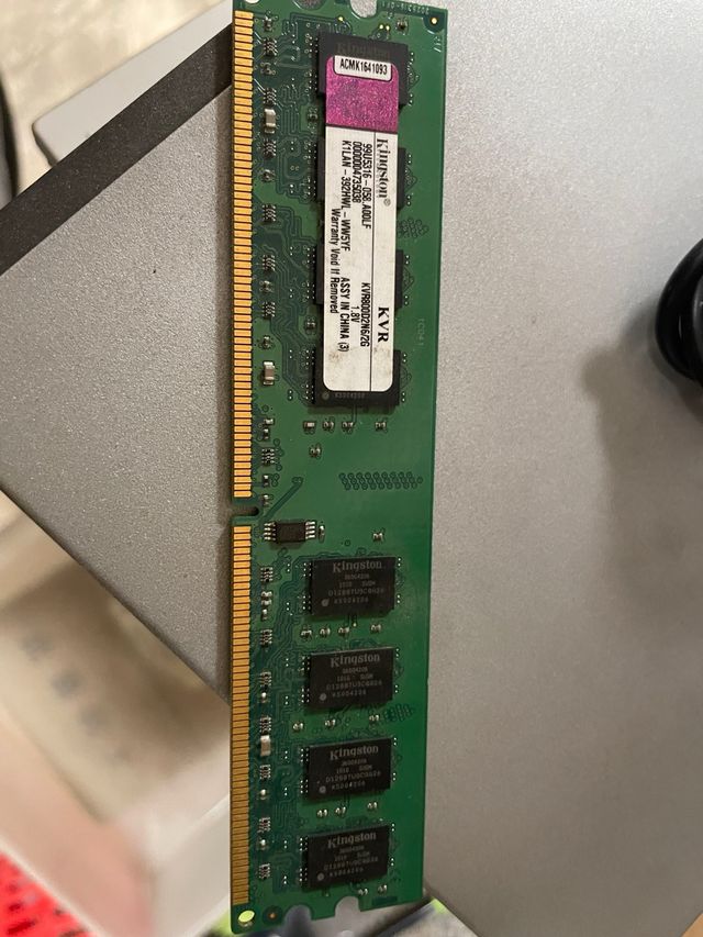 Módulo de memoria RAM Kingston. - Modelo: KVR800D2N6/2G - Capacidad: 2GB - Tipo: DDR2 - Velocidad: PC2-6400 - Voltaje: 1.8V - Fabricado en China.