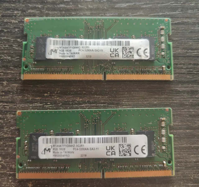Módulos de memoria RAM SODIMM DDR4 de Micron. - Capacidad: 8GB por módulo. - Velocidad: PC4-3200AA (3200MHz). - Fabricado en Taiwán.
