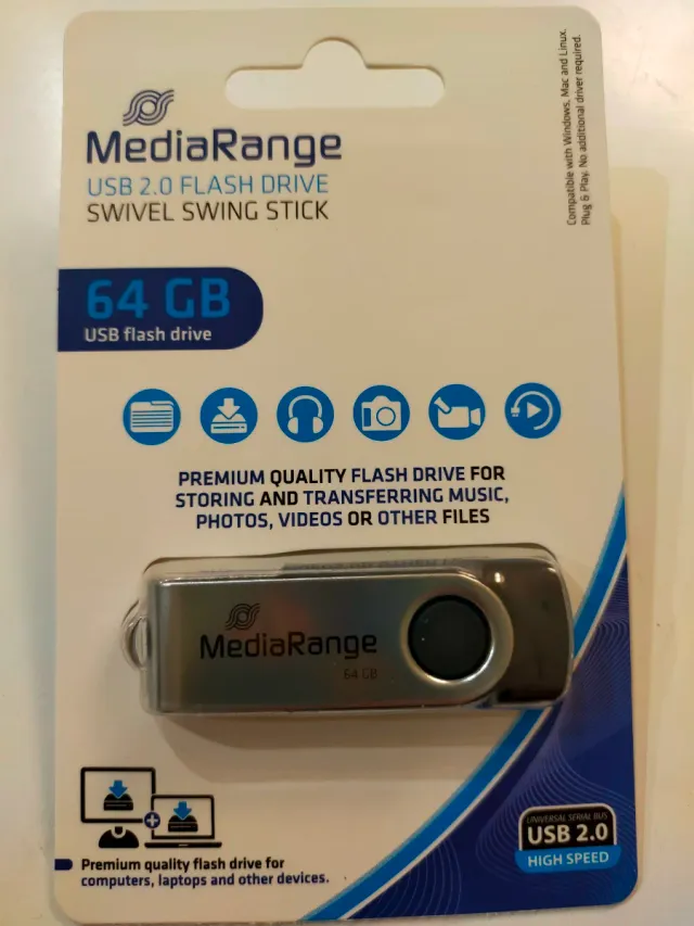 Detalles del productoMemoria flash drive USB de 64 GB 2.0 con diseño giratorio. Dispongo de 2 unidades nuevas sin abrir. 9 € c/u