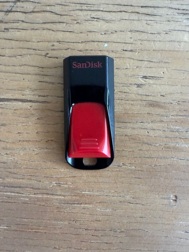 Memoria USB SanDisk de 64GB con un diseño compacto y moderno en color negro y rojo. - Capacidad de 64GB. - Diseño deslizante para proteger el conector.