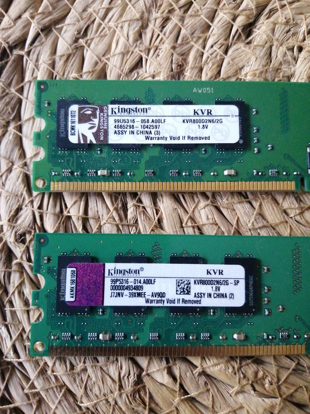 Par de memorias RAM Kingston en buen estado. - Modelo KVR800D2N6/2G y KVR800D2N6/2G-SP. - 2GB cada una. - 1.8V. - Fabricadas en China.