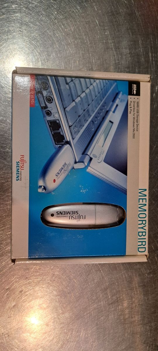 Detalles del productoMemoria USB Memory Bird de Fujitsu Siemens, en su caja original. Incluye la unidad USB y un disquete con drivers para Windows 98/2000. El dispositivo se ve en muy buen estado, sin señales de uso excesivo. - Unidad USB de 128 MB. - Disquete con drivers para Windows 98/2000. - Incluye cordón para llevar la memoria USB.
