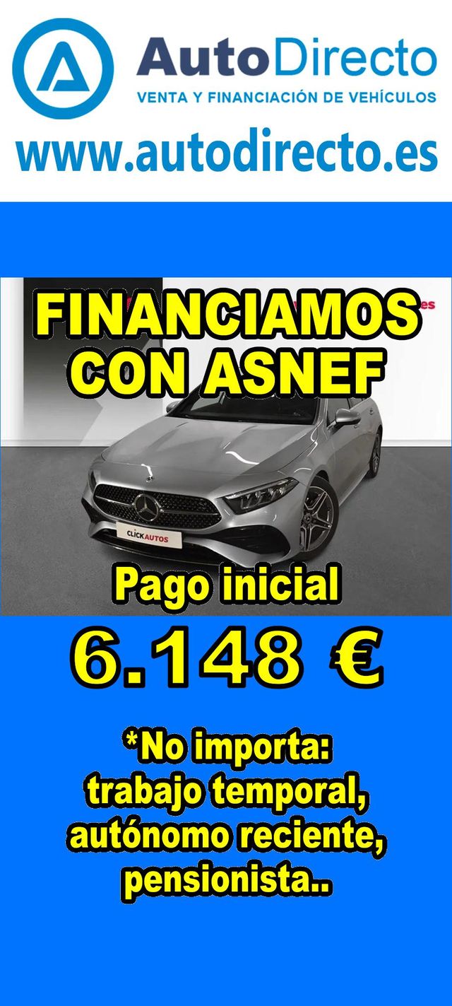 Detalles del producto¿No consigues financiación? ¡Tenemos la solución! *************************************************************************** RENT CREDIT: Aprobamos más del 90% de las operaciones. No importa ASNEF o RAI, impagos pendientes, ser autónomo o empresa reciente, ser pensionista. Imprescindible pago inicial del 20%. Ejemplo de operación: MERCEDES BENZ CLASE A 1.3 136CV 180 AMG LINE. Ref. W954813MRT - Precio vehículo financiado: 30740 €. - Pago inicial de 6148 €. - Cuota mes desde 636 €. - Impuesto de circulación y garantía (mínimo 1 año) incluidos. *************************************************************************** ✅ Más de 3.000 COCHES Y FURGONETAS EN STOCK. ✅ HASTA 2 AÑOS DE GARANTIA. ✅ Kilómetros certificados. ✅ 17 concesionarios repartidos en toda España. ♻️ Aceptamos tu coche como parte del pago. *************************************************************************** IMPORTANTE: -. Este anuncio, no es vinculante, puede contener errores. SE MUESTRAN A TÍTULO INFORMATIVO Y NO CONTRACTUAL. -. Consultar disponibilidad del vehículo y datos exactos: fecha de matriculación, importes, etc,... *************************************************************************** Te ofrecemos distintas opciones: financiación, renting, alquiler con opción a compra, rent credit. En nuestro stock disponible encontraras: 3008 , qashqai , corolla , rav4 , sandero , Duster , yaris , 2008 , Tucson , Ibiza , 208 , Sportage , a3 , c4 , Formentor , q3 , yaris cross , 500 , c3 , arona , zs , x1 , kona , corsa , clase a , león , 308 , serie 1 , golf , focus , captur , a1 , tiguan , i20 , t roc , stonic , xc40 , civic , q5 , serie 3 , glb , 5008 , ateca , clio , kuga , c hr , i30 , arkana , juke , a4 , x3 , cx 5 , xc60 , kamiq , taigo , Mustang , x6 , polo , ceed , karoq , x2 , Astra , niro , cx 30 , a5 , cooper , megane , moka , fiesta , hs , q2 , clase c , serie 3 , renegade , picanto.