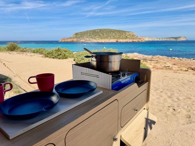 • Mueble camper personalizado con cocina integrada en el cajón lateral, con compartimentos organizados y cajonera para cubiertos.