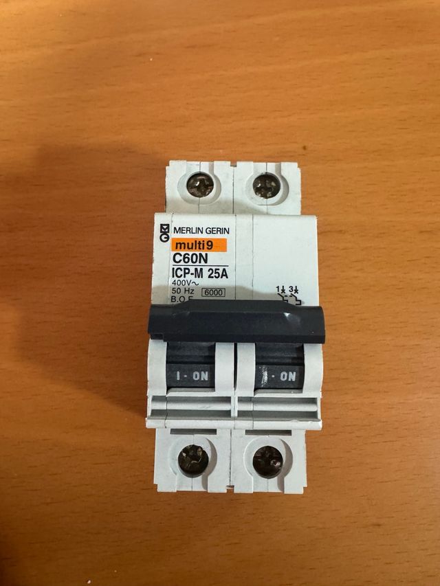 Interruptor general Merlin Gerin modelo C60N ICP-M. - Capacidad de 25A. - Voltaje nominal de 400V~. - Frecuencia de 50 Hz. - Poder de corte de 6000.