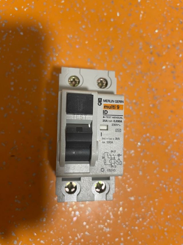 Disyuntor diferencial Merlin Gerin Multi 9 ID. - Modelo: multi 9 ID - Corriente nominal: 25A - Sensibilidad: 0,030A - Tensión nominal: 230V~ - Poder de corte: 3kA