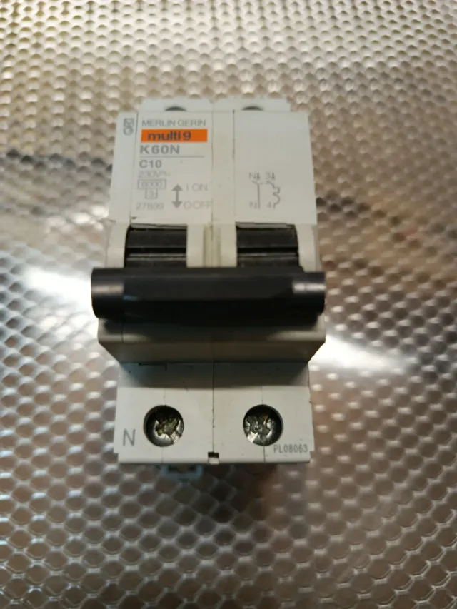Interruptor magnetotérmico Merlin Gerin. 27899 - Modelo: multi 9 K60N. - Intensidad: C10 (10A). - Tensión: 230V~. - Polos: 1P + N.