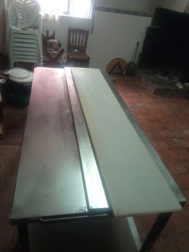 Detalles del productoMesa de acero inoxidable para carnicería en buen estado. Ideal para cortar carne o preparar alimentos.