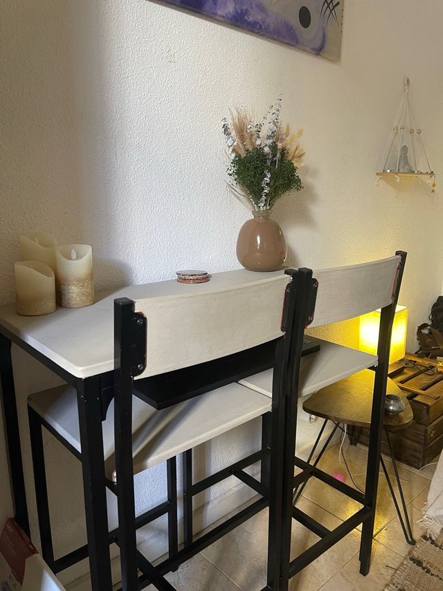 Detalles del productoConjunto de mesa alta con dos sillas a juego. Ideal para espacios reducidos o como zona de bar.