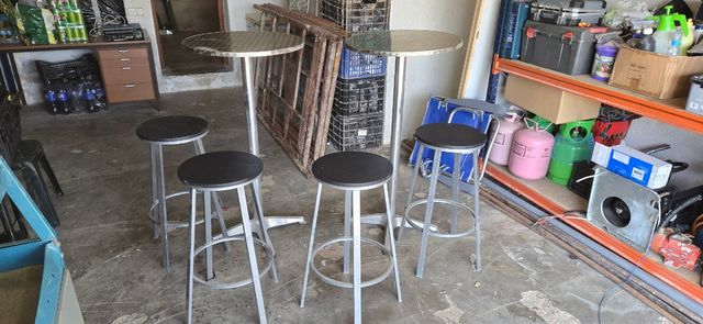 Conjunto de mesa alta redonda con cuatro taburetes. - Mesa con sobre metálico y base cromada. - Taburetes con asiento negro y estructura metálica.