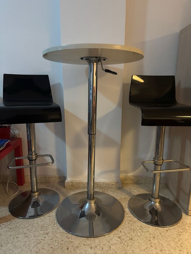 Conjunto de mesa alta con dos taburetes. - Mesa con base redonda y pie cromado. - Asientos de taburete negros y base redonda cromada. - Reposapiés en los taburetes.
