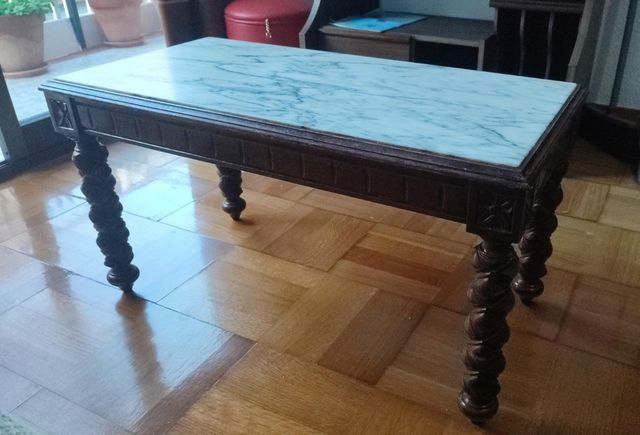 mesa antigua de madera, patas torneadas y madera trabajada, sobre de mármol claro con aguas. medidas 91 por 47 por 44 de alto