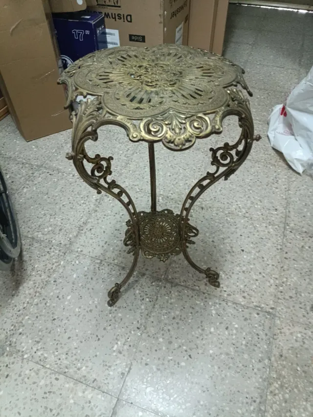 Detalles del productoElegante mesa auxiliar de bronce con un diseño clásico y ornamentado. Sus dimensiones son 75 cm de alto por 38 cm de ancho.