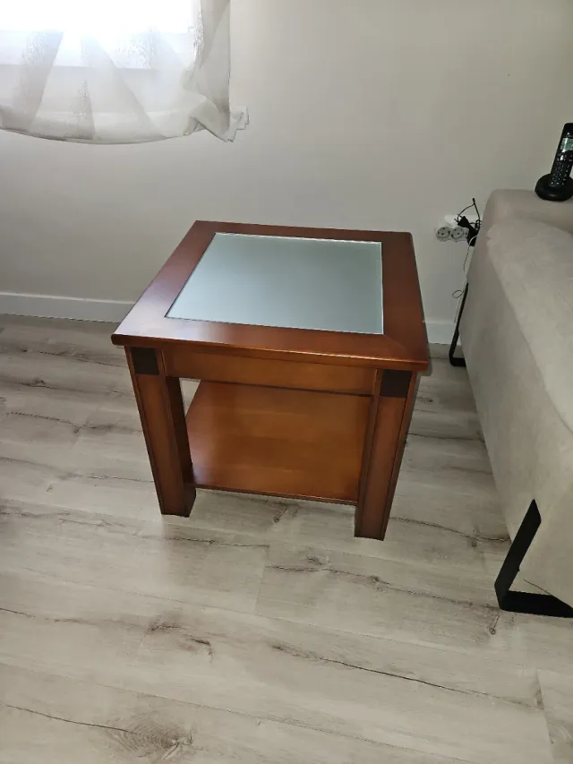 Mesa auxiliar salón madera y cristal ácido