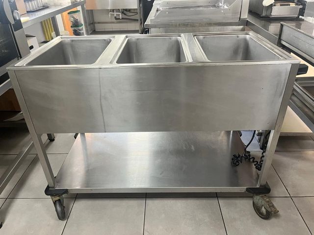 Detalles del productoMesa de acero inoxidable con sistema de baño maría. Ideal para mantener alimentos calientes.