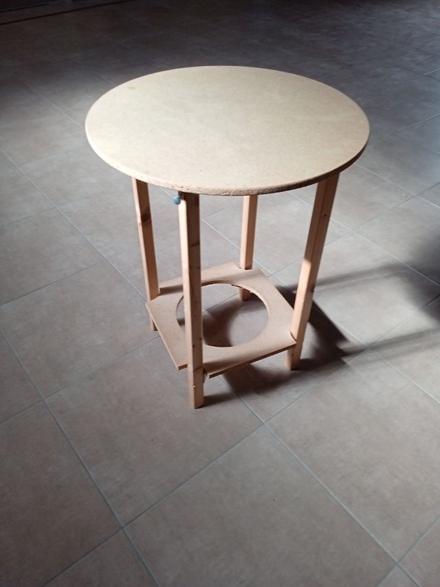 Detalles del productoMesa auxiliar con posibilidad de falda para vestir color granate de tapicería y también tapete de hilo y ganchi Medidas del producto