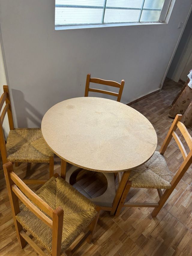 Conjunto de mesa camilla redonda con cuatro sillas. - Mesa con tablero de madera. - Sillas con asiento de esparto.