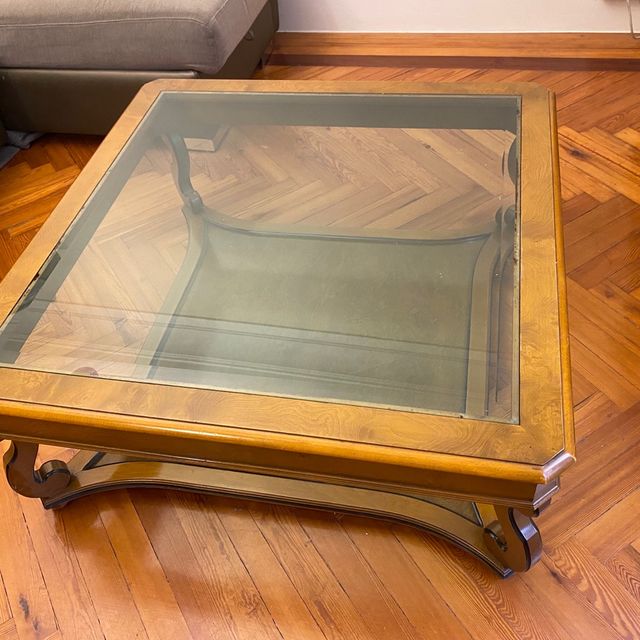 Detalles del productoElegante mesa centro de cerezo de alta calidad con cristal transparente biselado. Dimensión: 1m x 1m altura 45 cm. Cuenta con dos superficies de apoyo: la superior con cristal y la de abajo con madera de cerezo perfecta para situar elementos decorativos. Ambas superficies están sostenidas por cuatro patas finamente contorneadas. Sin envío Medidas del producto