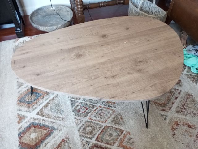 Detalles del productoMesa de centro de forma ovalada con patas de metal. Es de madera con un acabado en tono marrón claro. Se encuentra en buen estado.