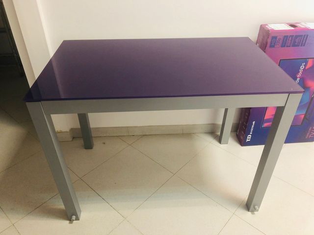 Detalles del productoVendo mesa con cristal en color berenjena. Medidas: 100x60 cm. No es extensible. Está nueva, muy poco uso. No tiene manchas ni nada. En las patas traseras tiene un tope por si se quiere poner contra la pared.