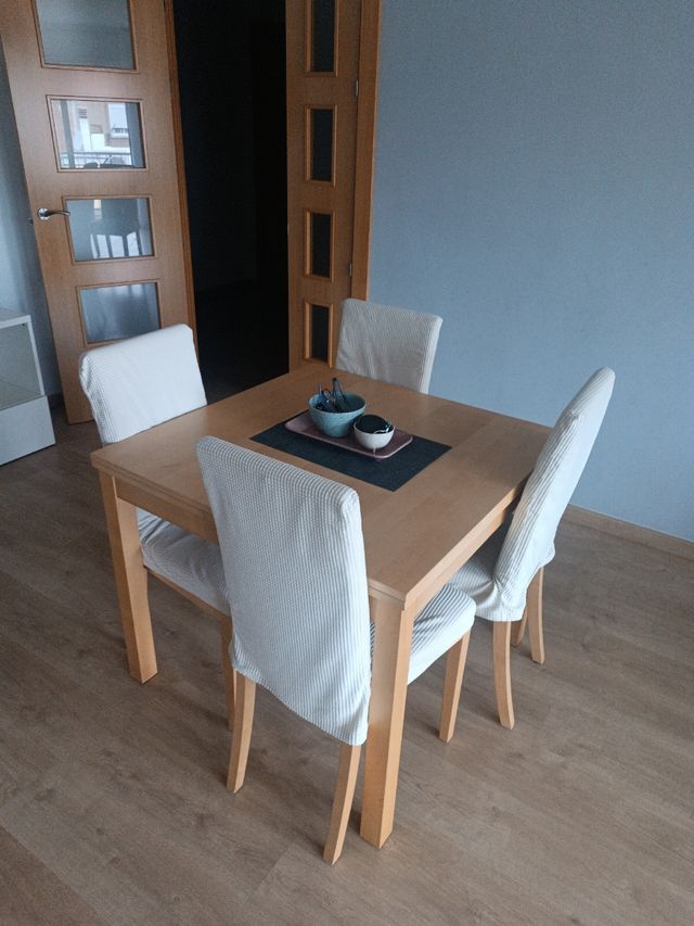 Detalles del productoConjunto de mesa de comedor cuadrada extensible de madera clara y cuatro sillas. Las sillas tienen fundas de tela color crema. La mesa está en buen estado.