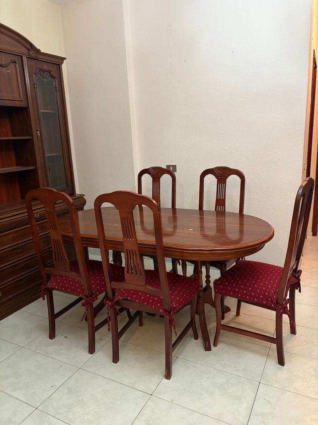 Detalles del productoConjunto de mesa de comedor ovalada de madera y seis sillas a juego. La mesa y las sillas presentan un bonito acabado en madera oscura.
