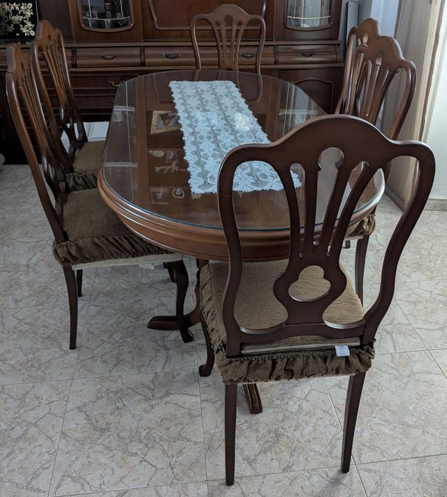 Detalles del productoElegante mesa de comedor de madera maciza con seis sillas a juego. Se encuentra en buen estado.