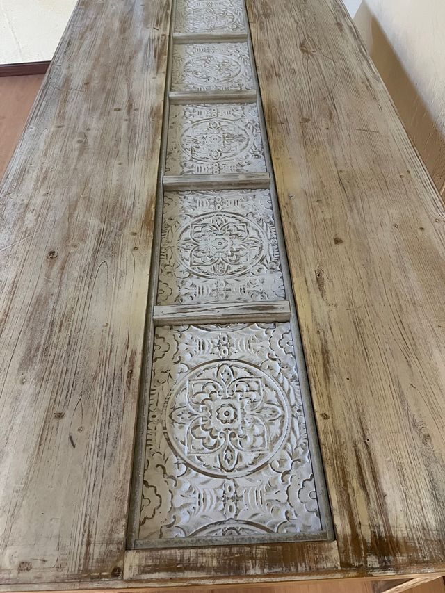 Detalles del productoMesa comedor madera decapada en blanco, con talla en el centro cubierta por cristal de 180 x90. Se desmontan las patas para el transporte. Es muy vistosa y las tallas a mano tipo flor de loto. Minimalista Medidas del producto