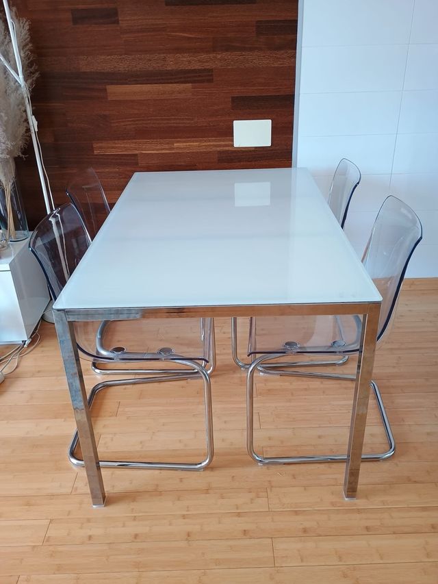 Detalles del productoConjunto de Mesa de cristal opaco con base metálica y 4 sillas de acrílico transparente con estructura metálica.