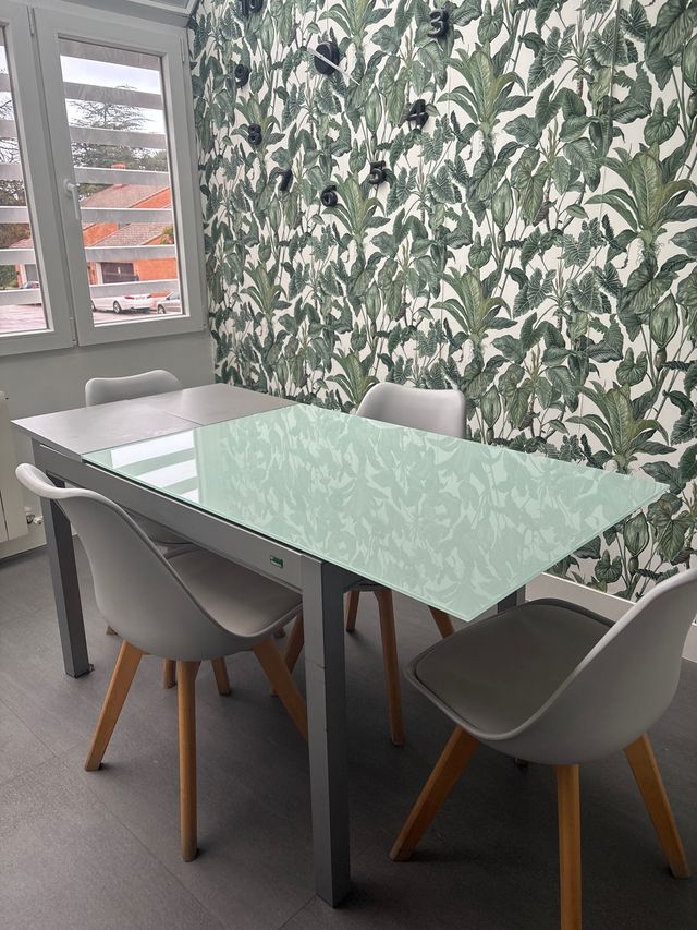 Mesa comedor cristal y metal + 5 sillas. Usado