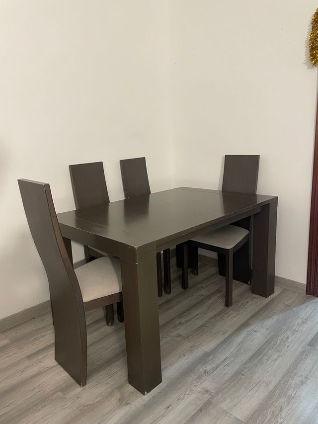 Incluye cuatro sillas a juego, tapizadas en gris claro.