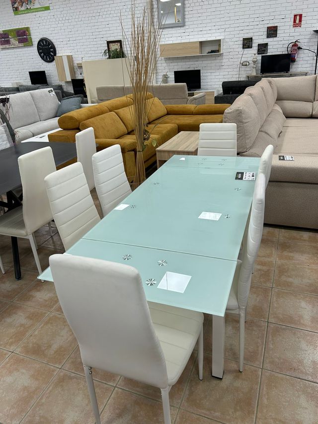Mesa de comedor extensible, con tablero de cristal y patas de aluminio, con cantoneras anti-rayado. Sillas de poli-piel sintético con estructura metálica.