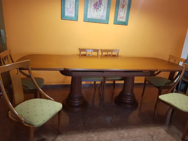 Detalles del productoConjunto de mesa de comedor extensible con seis sillas a juego. Ideal para reuniones familiares o con amigos.