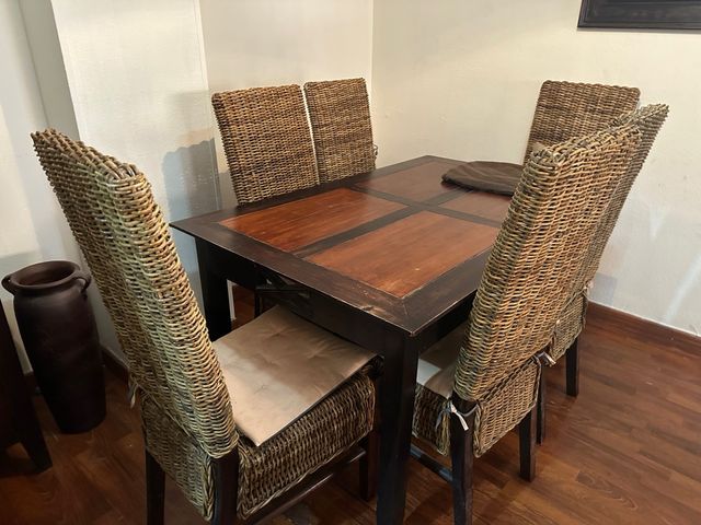 Detalles del productoConjunto de mesa de comedor con estructura de madera oscura y cuatro sillas de ratán.