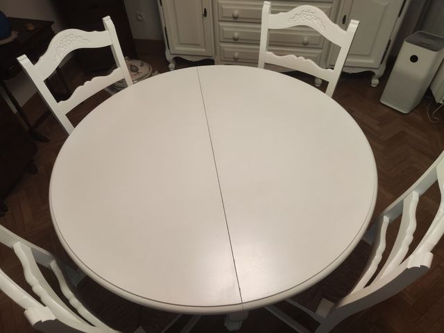 Detalles del productoPrecioso conjunto de mesa de comedor redonda y cuatro sillas de estilo Provenzal. 120 a 150 cm