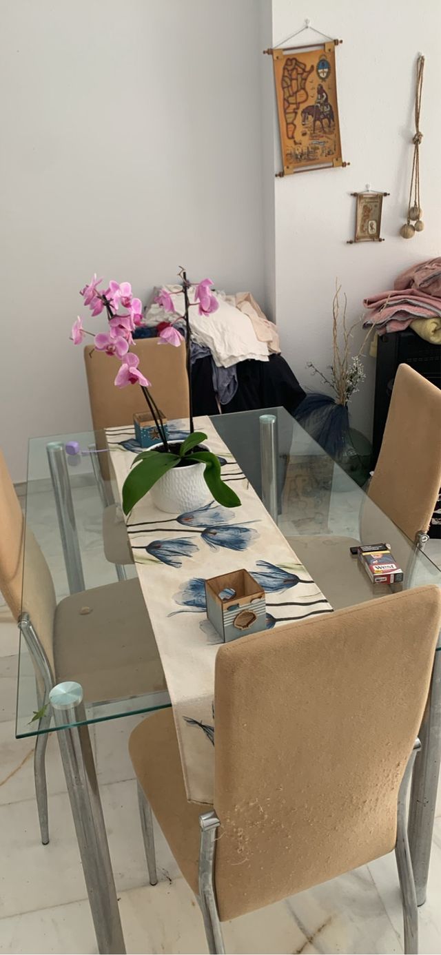 Detalles del productoConjunto de mesa con sobre de cristal y cuatro sillas de comedor.