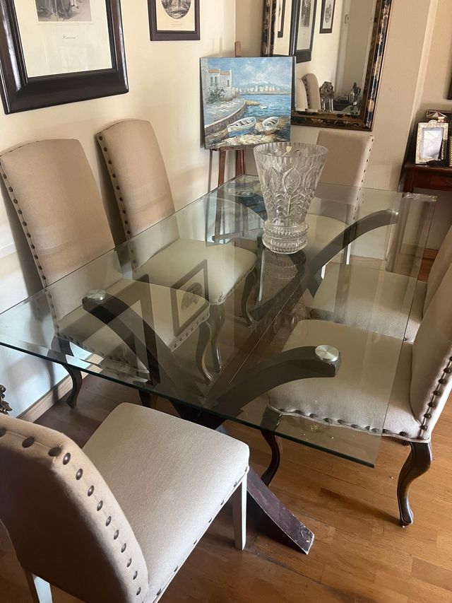 Mesa cristal + 6 sillas beige