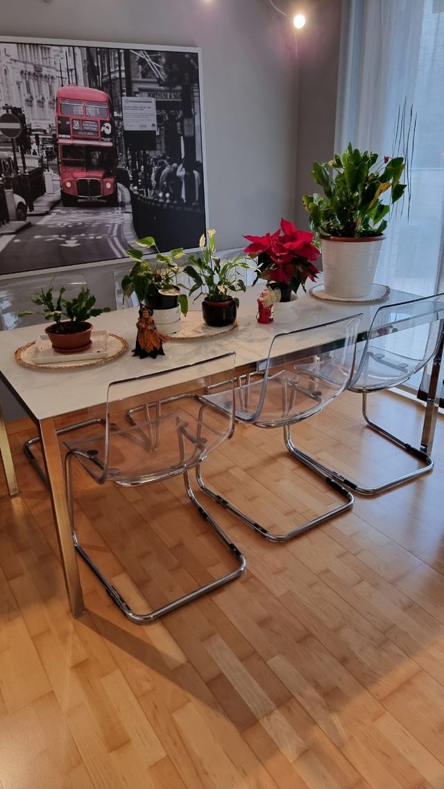 Detalles del productoPerfecto estado conjunto de mesa cristal con 6 sillas de metraquilato, ideal para comedor o sala de reuniones para empresa. Mesa de cristal templado blanco con estructura de acero inoxidable. Medidas 180 largo 85 de ancho y 74 de alto. Las sillas son el asiento y respaldo de 1 sola pieza en metraquilato y estructura en acero inoxidable precio Ikea modelo TOBIAS actual por unidad de 89 euros con medidas 55 ancho fondo 56 altura 82.. Medidas del producto