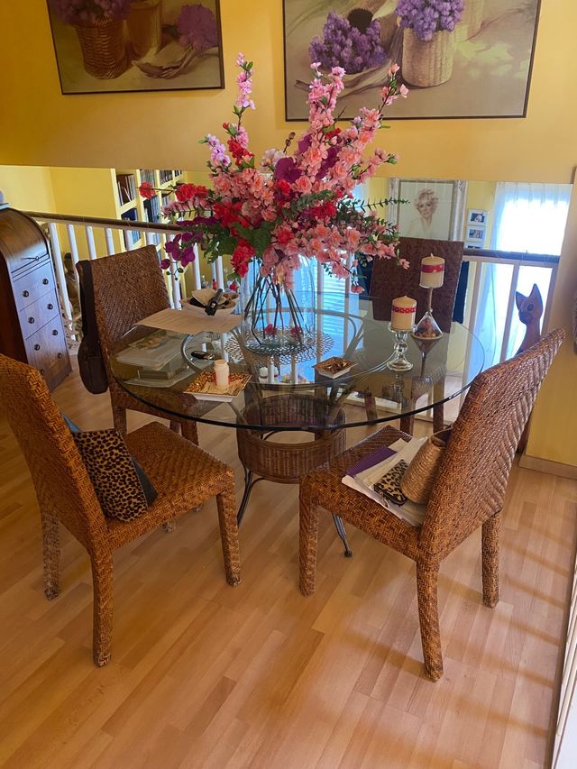 Detalles del productoPreciosa mesa de cristal con cuatro sillas de mimbre. Ideal para cualquier espacio.