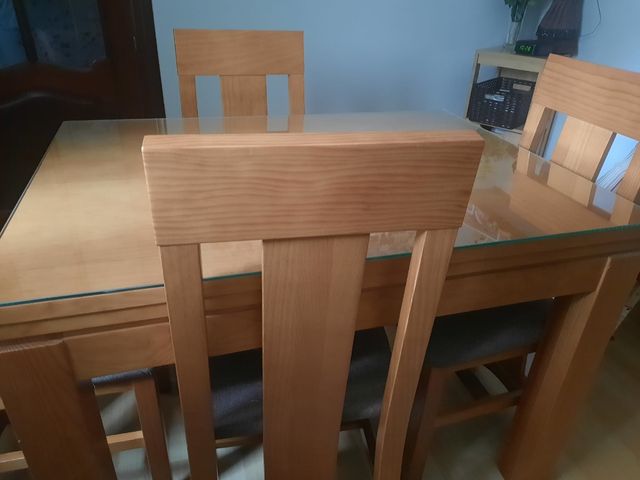 Conjunto de mesa con superficie de cristal y cuatro sillas de madera. - Mesa con sobre de cristal. - Estructura de las sillas en madera.