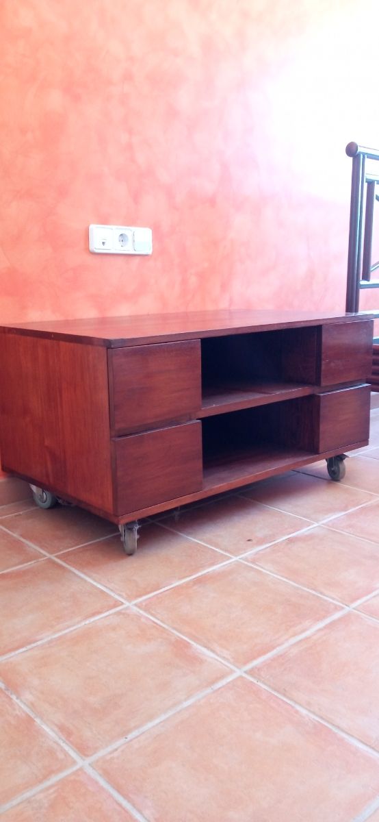 De madera de Teka con 4 ruedas, 4 cajones de 25 cm ancho x 17cm alto x 50cm largo, 2 huecos de 53 cm fondo x 46 cm ancho y 21 cm alto.
