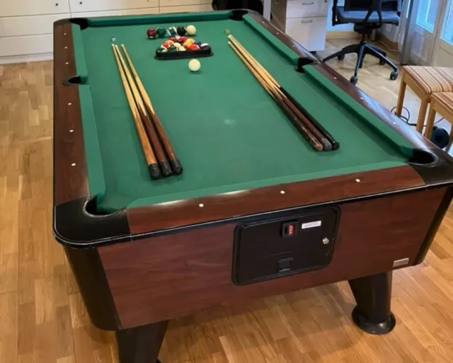 Detalles del productoMesa de billar de madera con superficie de juego verde.