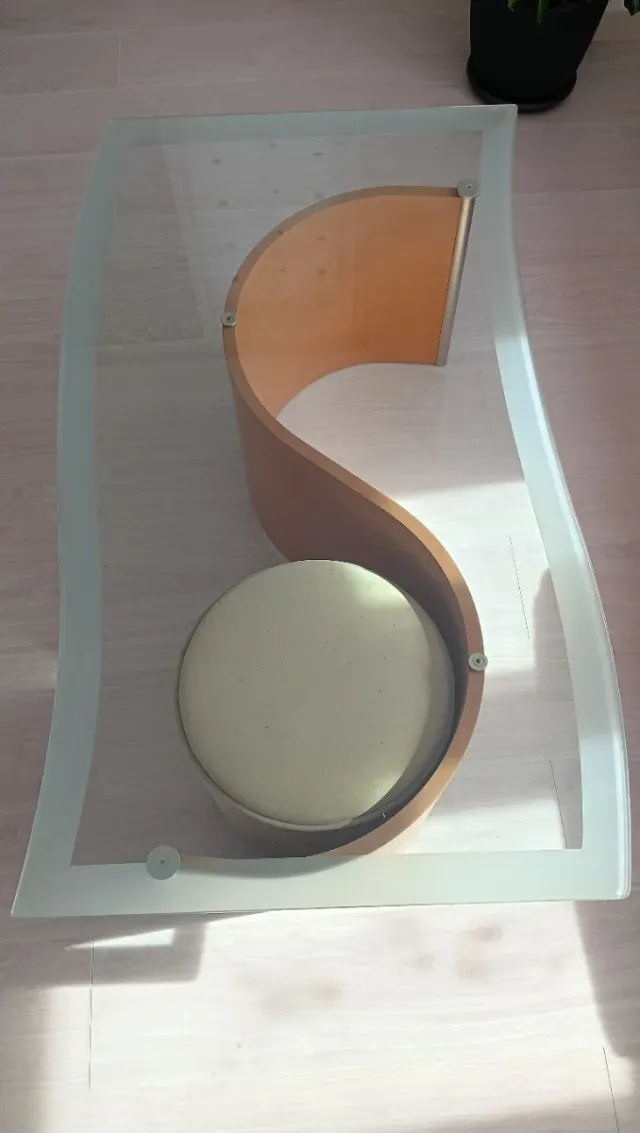 Elegante mesa de centro con un diseño moderno y curvo. Combina una superficie de cristal transparente con una base de madera en tono marrón, creando un punto focal único en tu salón.