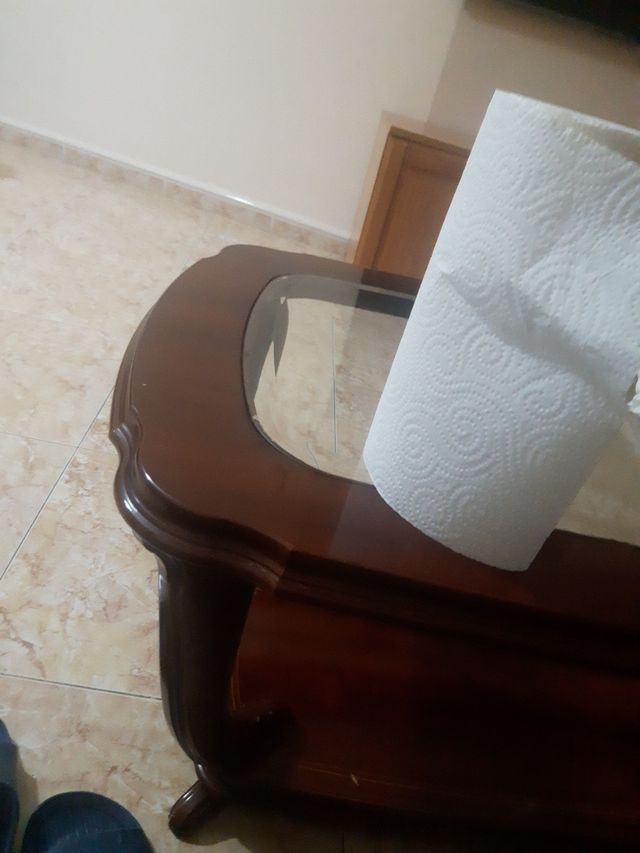 Detalles del productoElegante mesa de centro con estructura de madera oscura y tapa de cristal.