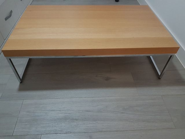 Preciosa mesa en madera de roble con patas en cromado con brillo,de muy buena calidad. Medidas 1m 02cm de largo. 60cm de ancho y 30cm de altura.