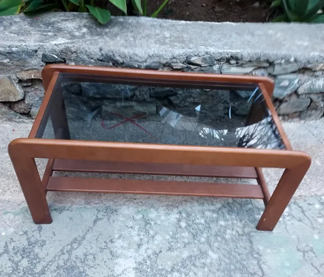 Detalles del productoElegante mesa de centro con estructura de madera y superficie de cristal.