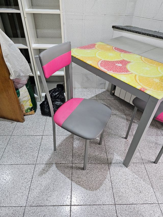 Conjunto de mesa de cocina con dos sillas. - Diseño moderno con superficie estampada de cítricos. - Sillas con asiento y respaldo en gris y rosa.
