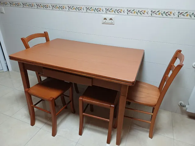 Detalles del productoConjunto de mesa de cocina con sillas y taburetes. Se puede abrir y alcanzar 180 cm.