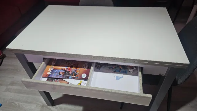 Mesa de cocina extensible gris y blanca,abierta1,5