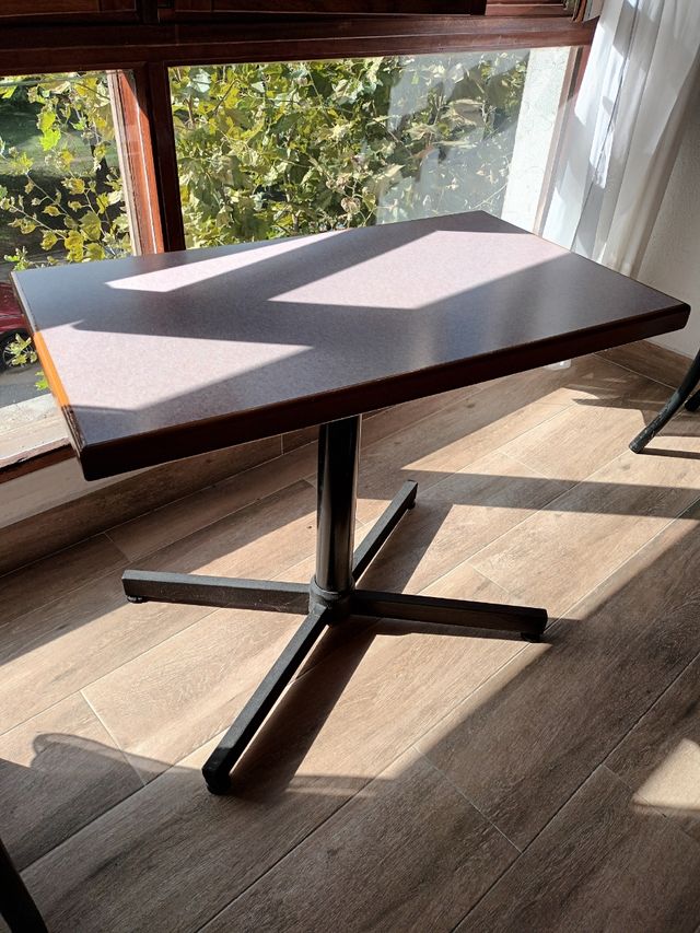 Detalles del productoMesa de comedor con superficie de color claro y borde oscuro. La base es metálica y negra. Hay disponibles 20 sillas y 10 mesas. Se venden por separado, por unidad o en lote. Silla 10€, mesa 20€. Conjunto mesa + 2 sillas 30€.